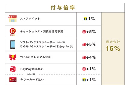 最高の15.5%還元を受けられる人は少ないかもしれませんが、「ペイペイ払い」「ヤフープレミアム会員」「ソフトバンクユーザー」の3つを達成しているだけで10%も還元されますので非常にお得です。