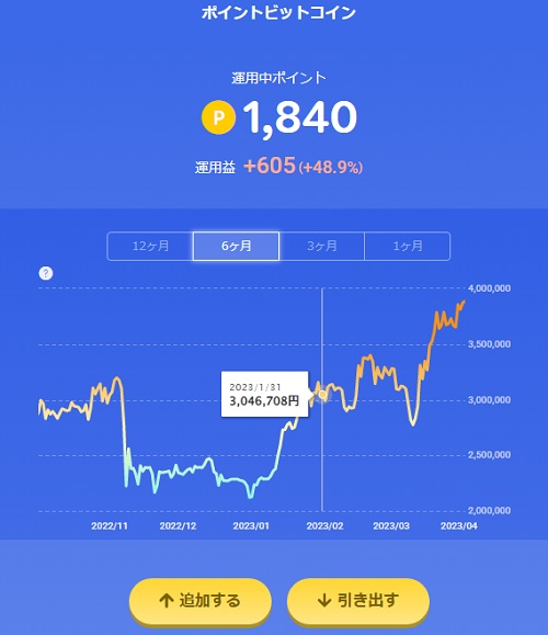 楽天ウォレットが提示するビットコインの取引価格を考慮したポイント数が差し引かれて運用中ポイントに追加されます。追加した時点で含み損になることがあります。