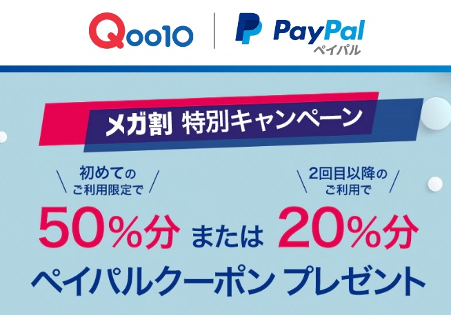 期間中、Qoo10でお買い物する際にペイパル(PayPal)で決済すると、初めてペイパル(PayPal)で決済することで総支払額の50%OFFクーポン、2回目以降の方は総支払額の20%OFFクーポンがプレゼントされます。