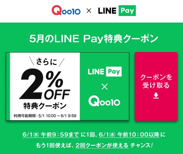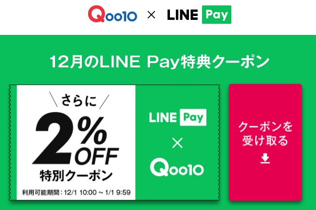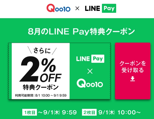 Qoo10でのお買い物時に、LINE Payで決済すると合計金額から、さらに1%オフになるスペシャルなクーポンです。
